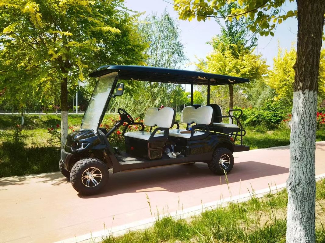Black Six-Seater Electric Golf Cart McPherson Independent Suspension 4kw Lithium Battery 72v Off-Road Tires